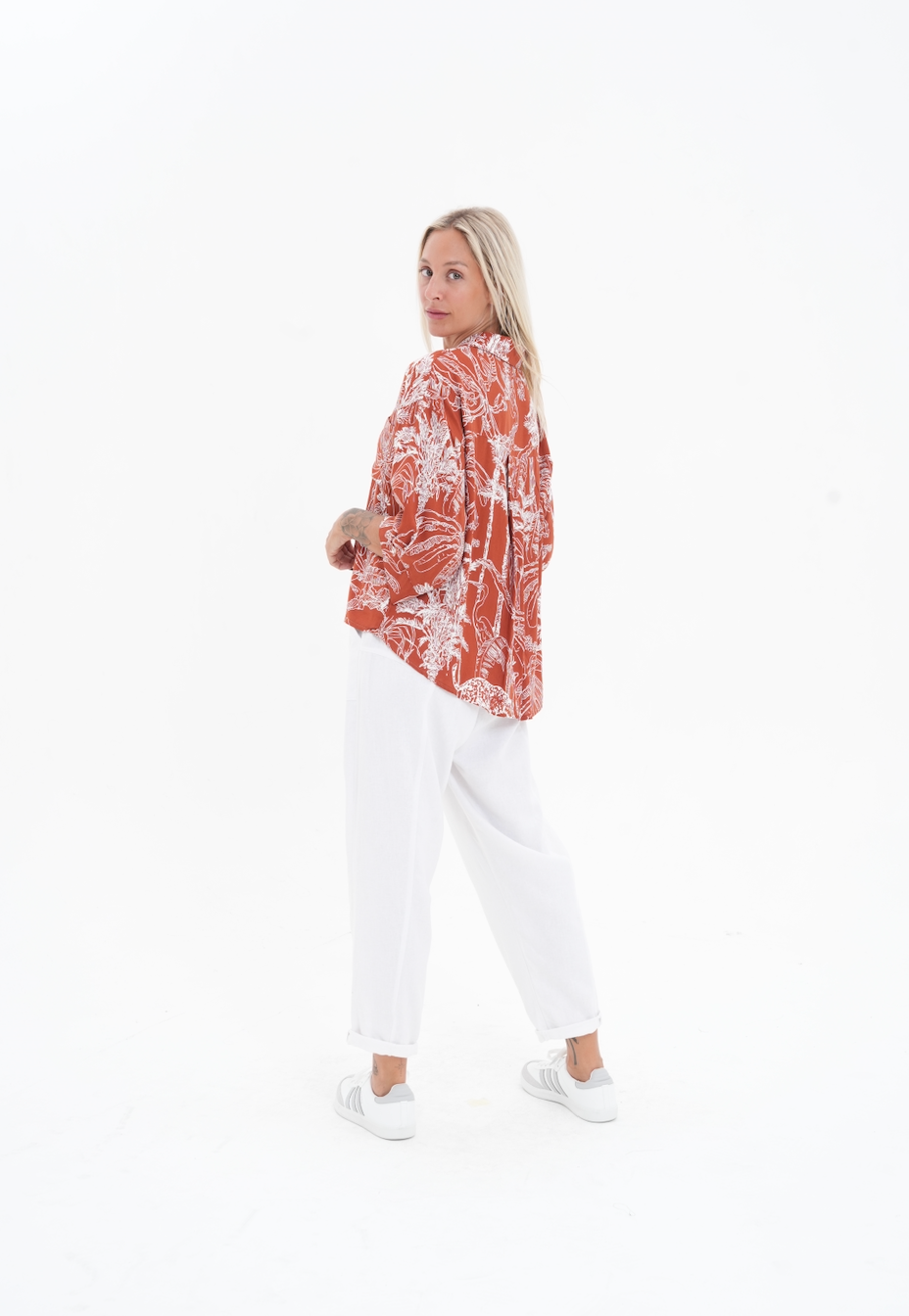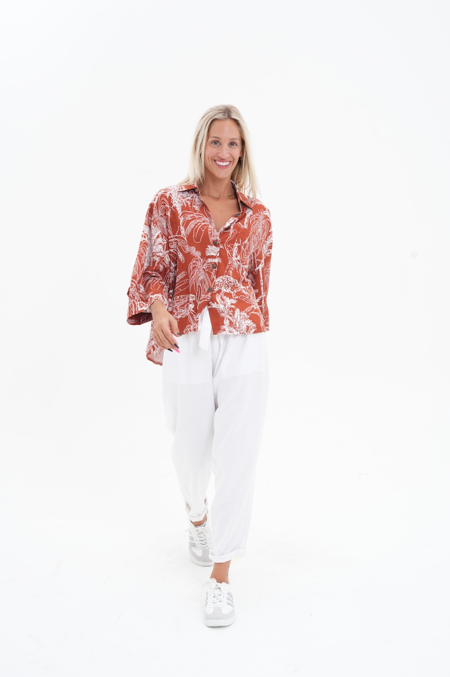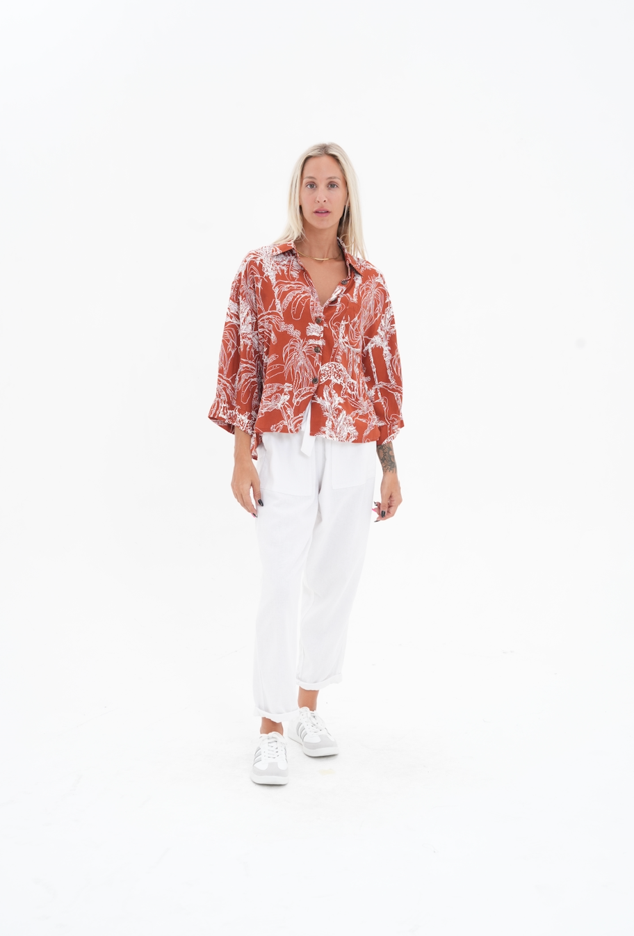 Relaxed yet refined, the Caymen Shirt is a timeless staple with a tropical twist. Designed with a loose, flowy fit and button-down front, it offers effortless versatility — wear it tucked in, tied at the waist, or left open as a lightweight layering piece. The earthy rust base with intricate white tropical print brings an elevated bohemian feel, perfect for coastal getaways or relaxed everyday styling.