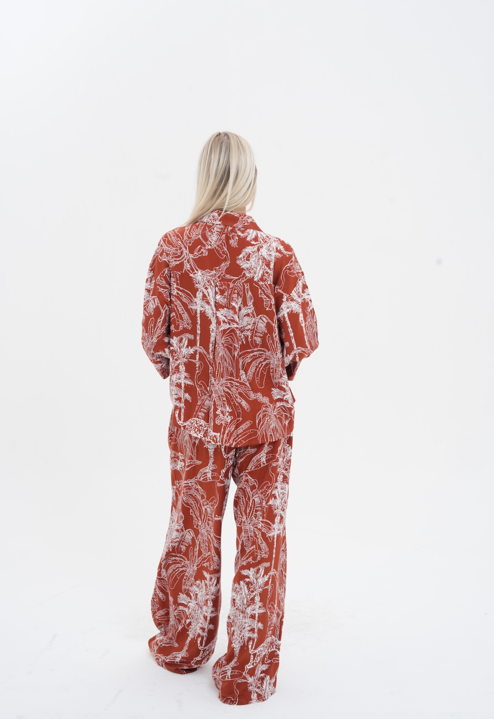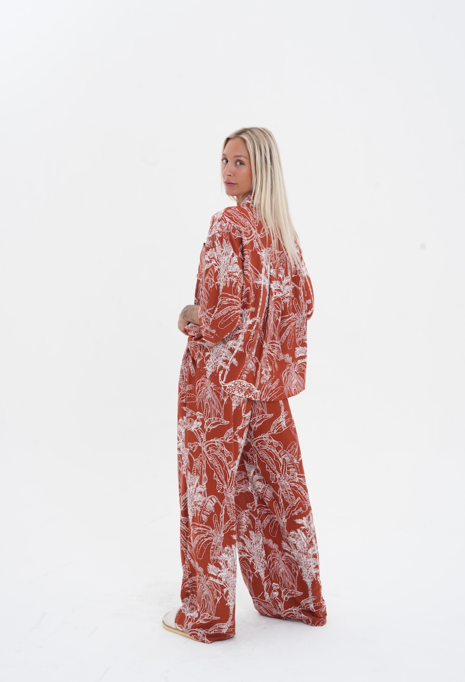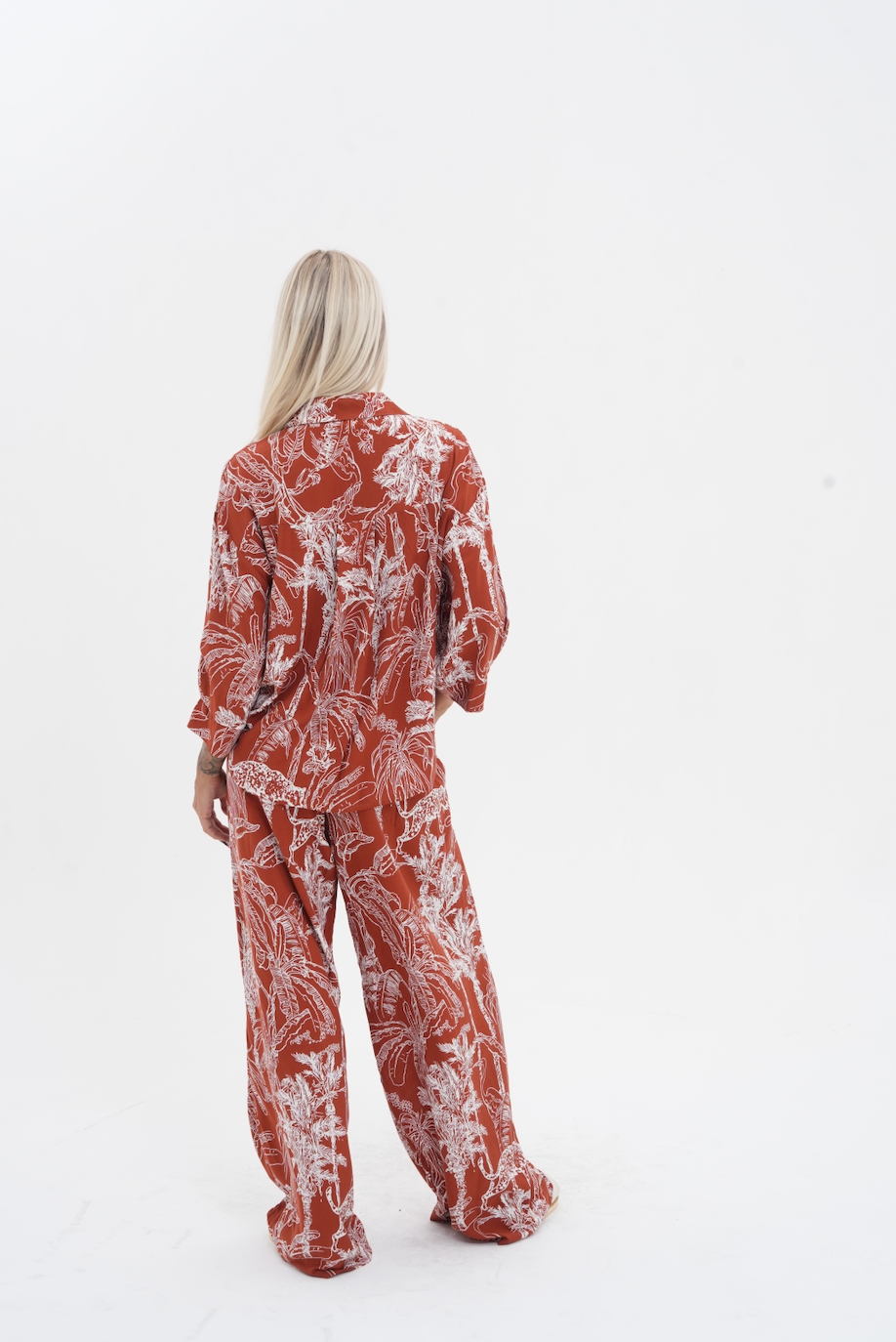 Relaxed yet refined, the Caymen Shirt is a timeless staple with a tropical twist. Designed with a loose, flowy fit and button-down front, it offers effortless versatility — wear it tucked in, tied at the waist, or left open as a lightweight layering piece. The earthy rust base with intricate white tropical print brings an elevated bohemian feel, perfect for coastal getaways or relaxed everyday styling.