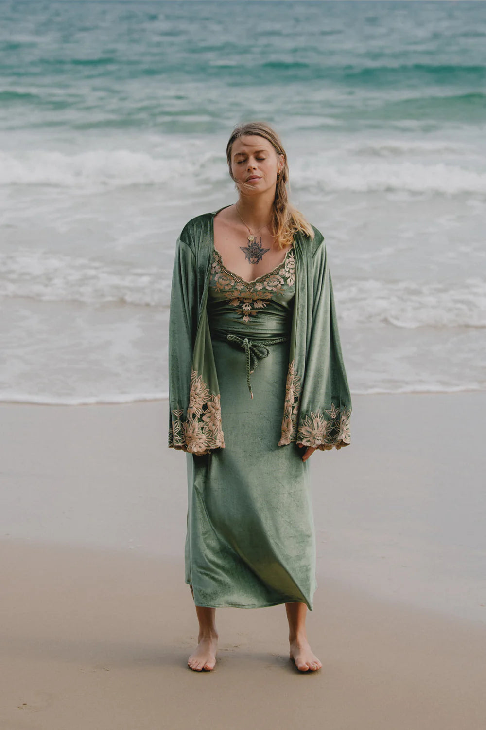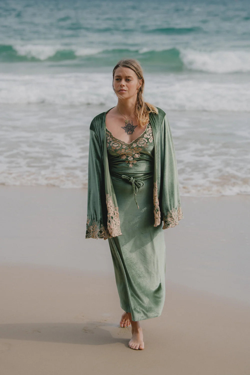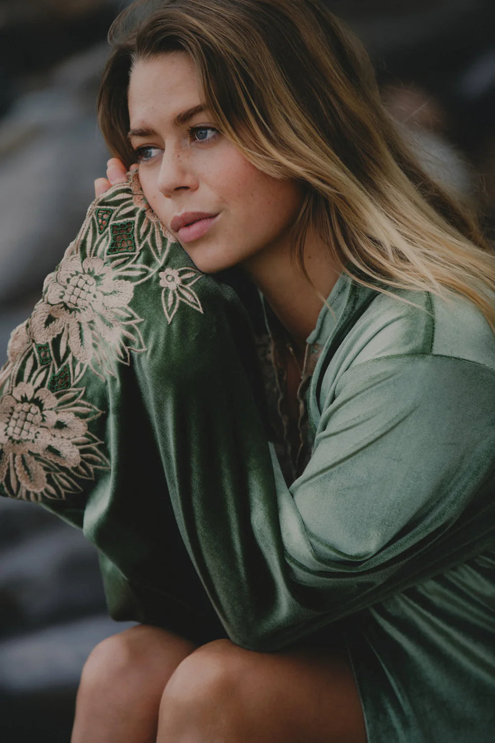 Inspired by the iconic, free-spirited style of Jimi Hendrix, our newest cropped kimono-style jacket in the lush Moss hue is a true statement piece designed to be treasured. Crafted from luxurious silk velvet, it drapes effortlessly with soft bell sleeves, intricate contrast embroidery on the cuffs, and delicate detailing along the front hem.
