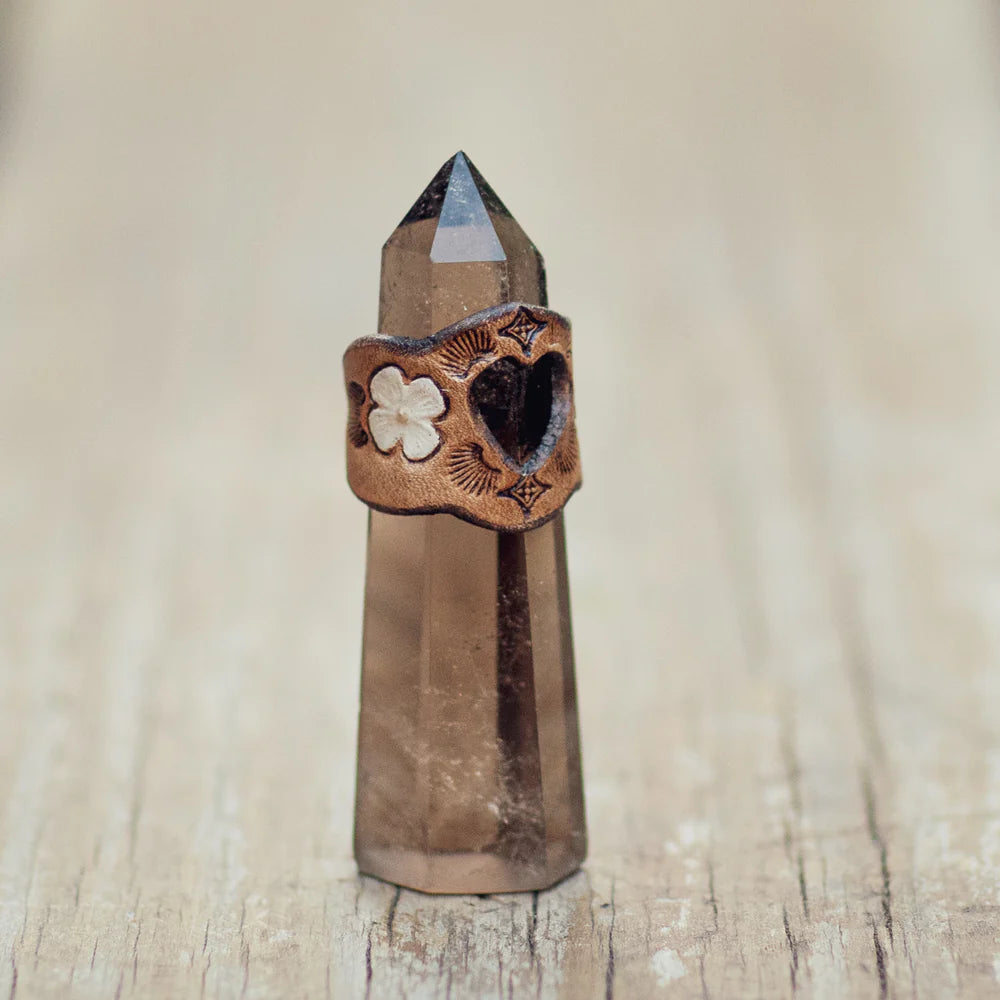 This gorgeous little leather ring is made of hand tooled vegetable tan leather and features beautifully hand painted flowers on either side of a love heart cut-out. The ring comes in a variety of colour themes to create your favourite look.